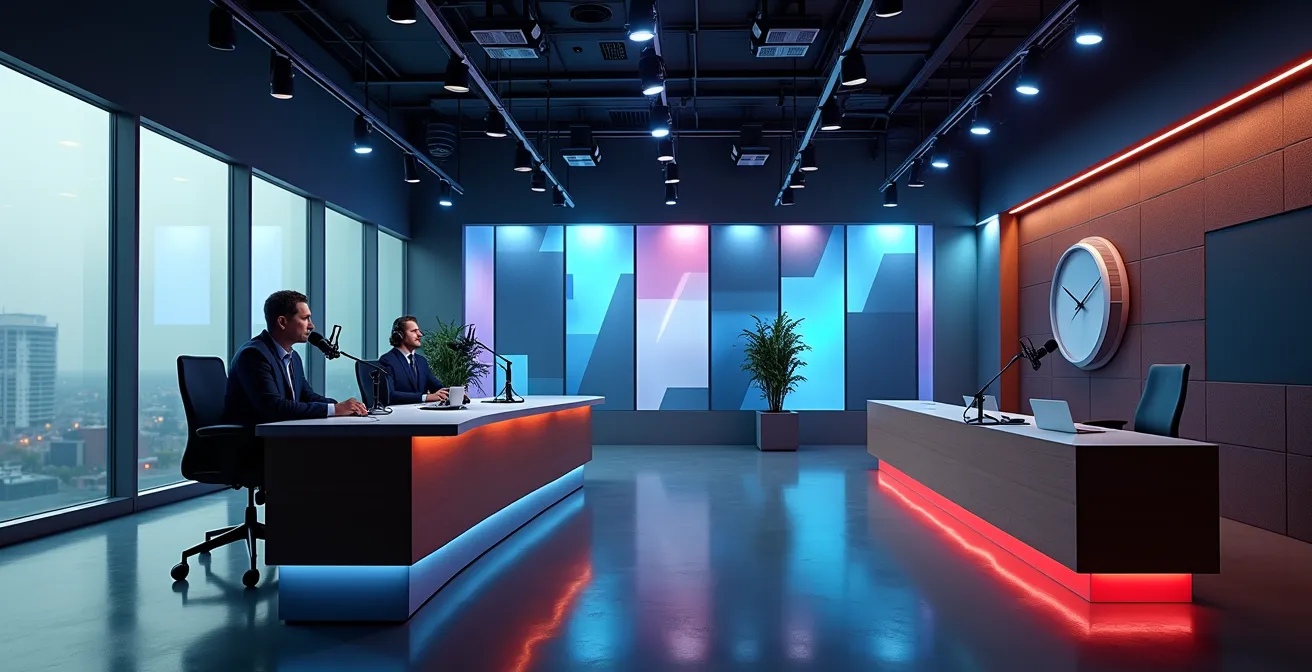 El concepto del estudio de radio como una «pecera» insonorizada y funcionalmente austera ha muerto. Hoy, su estudio es su principal activo de marketing visual. Debe ser concebido desde cero como un plató sonoro: un entorno visualmente atractivo, dinámico y modular que comunique la identidad de su marca incluso con el volumen a cero. La iluminación, el mobiliario, el fondo y la disposición de los micrófonos ya no responden solo a criterios acústicos, sino también a un plan de realización visual. Piense en ello como el escenario de un teatro: cada elemento contribuye a la narrativa.
